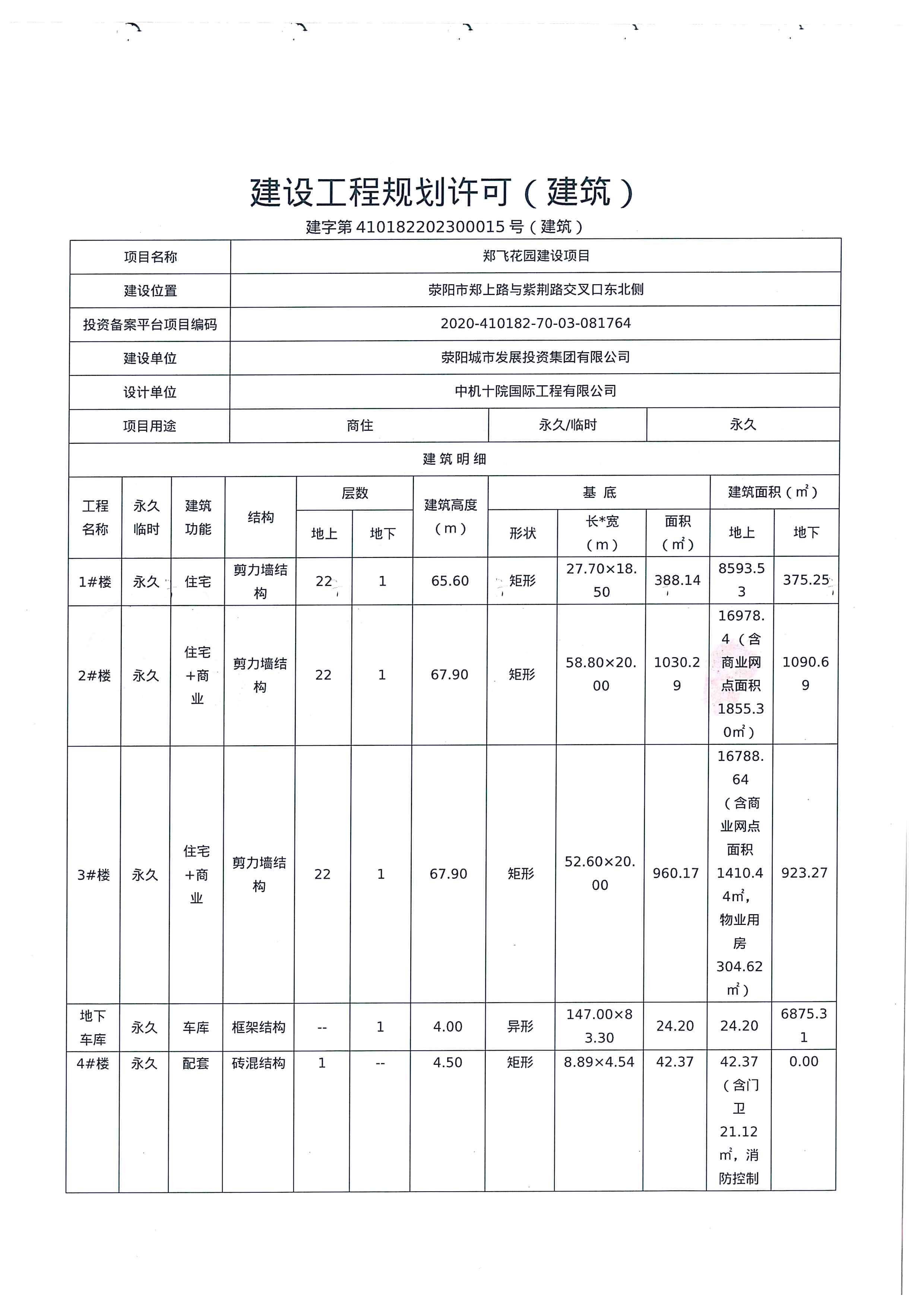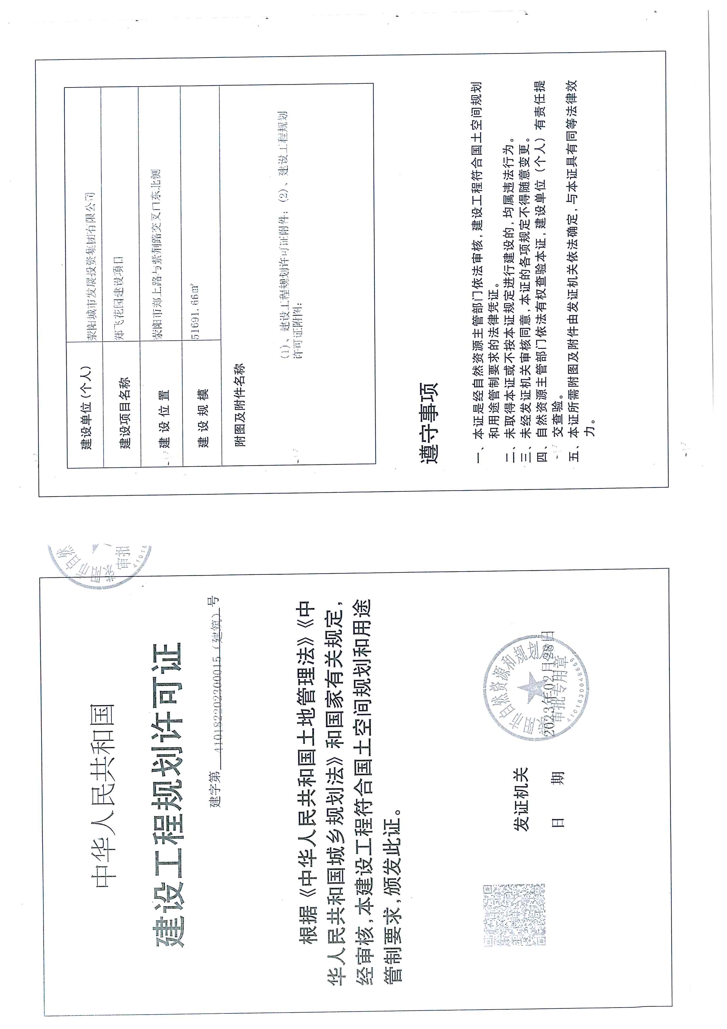 荥阳城市发展投资集团有限公司郑飞花园建设项目《建设工程规划许可证》已经我局荥规建字第410182202300015(建筑)号批准,根据有关法律、法规和《河南省城市规划公示制度》的要求,现予以公告。